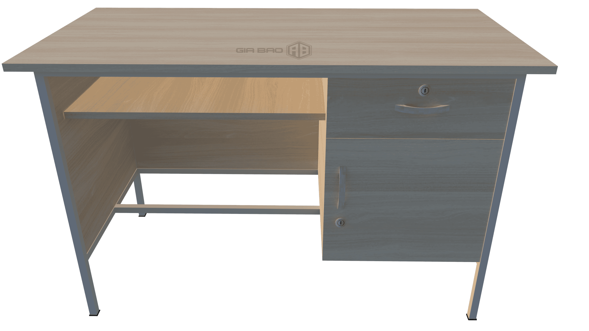 - Bên phải bàn gồm 01 hộc kéo và 1 hộc mở có khóa.