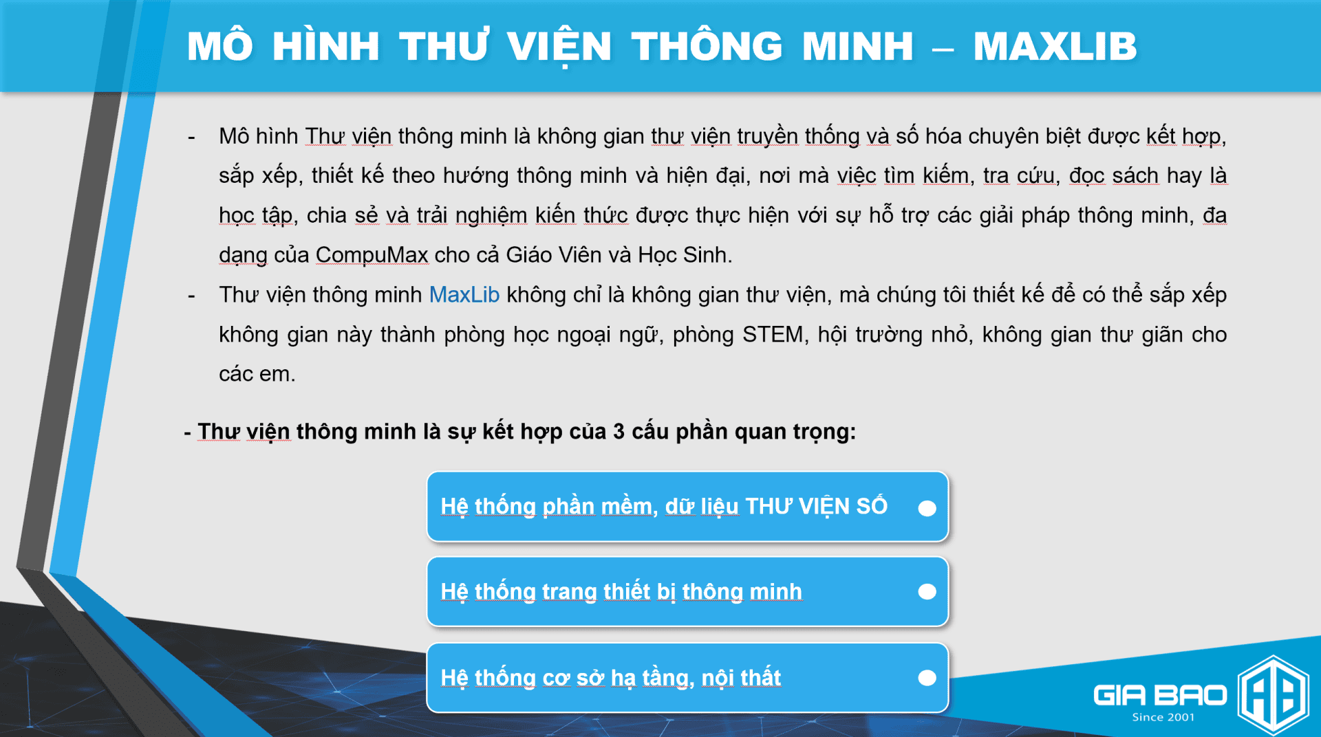 Mô hình Thư viện thông minh là không gian thư viện truyền thống và số hóa chuyên biệt được kết hợp, sắp xếp, thiết kế theo hướng thông minh và hiện đại, nơi mà việc tìm kiếm, tra cứu, đọc sách hay là học tập, chia sẻ và trải nghiệm kiến thức được thực hiện với sự hỗ trợ các giải pháp thông minh, đa dạng của CompuMax cho cả Giáo Viên và Học Sinh.